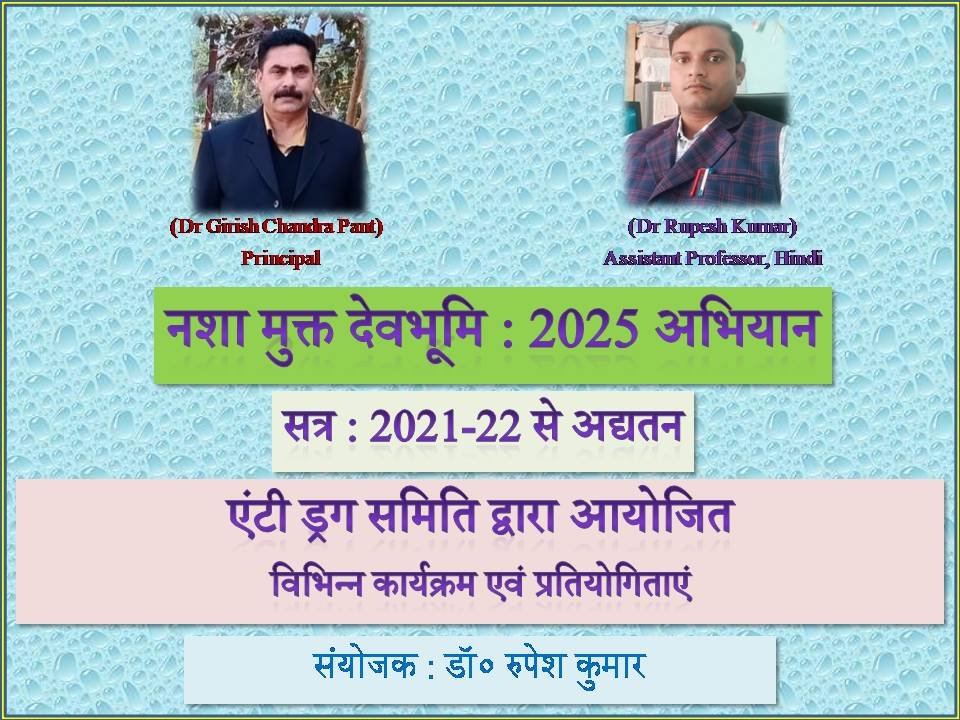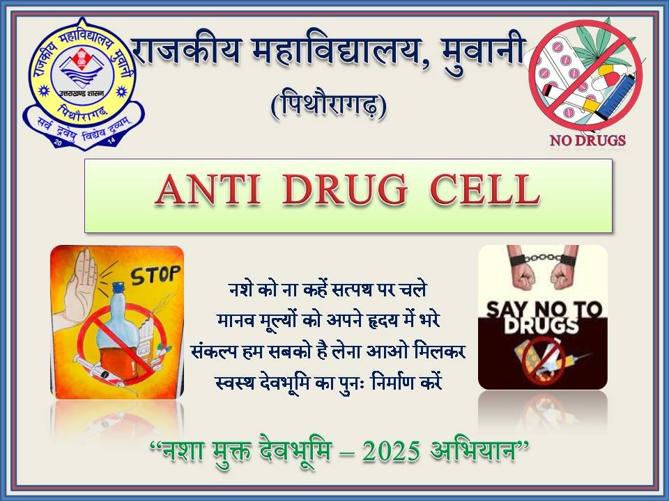 राजकीय महाविद्यालय मुवानी, पिथौरागढ़ में गठित एंटी ड्रग समिति का उद्देश्य महाविद्यालय परिसर को नशा-मुक्त, सुरक्षित एवं सकारात्मक शैक्षणिक वातावरण के रूप में विकसित करना है। नशा आज की युवा पीढ़ी के लिए एक गंभीर सामाजिक चुनौती बन चुका है, जो न केवल शारीरिक स्वास्थ्य को प्रभावित करता है, बल्कि मानसिक संतुलन, नैतिक मूल्यों और शैक्षणिक उपलब्धियों पर भी प्रतिकूल प्रभाव डालता है। महाविद्यालय, जहाँ से भावी समाज-निर्माताओं का निर्माण होता है, यदि नशे से प्रभावित होता है तो उसका दुष्प्रभाव व्यापक सामाजिक स्तर पर देखने को मिलता है।